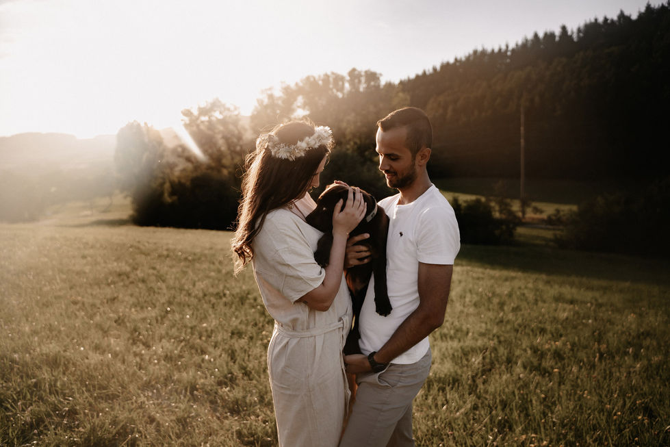 Das Verlobungsshooting mit Jasmin und Patrik fand in der Abendsonne statt. Besonders spannend war es mit Labrador Sammy, der uns als Junghund ganz schön auf trab gehalten hat.